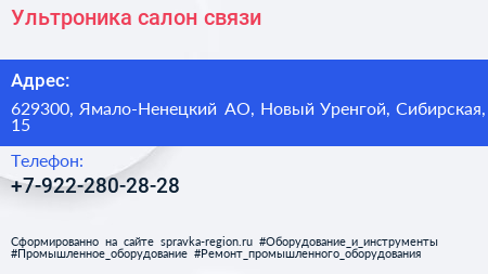 Ультроника, салон связи по адресу 629300, Ямало-Ненецкий АО, Новый Уренгой, Сибирская, 15 в дальнейшем Организация, размещена в следующих категориях: