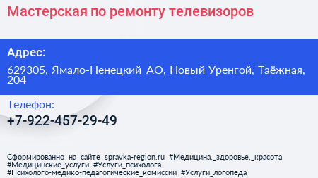 Мастерская по ремонту телевизоров по адресу 629305, Ямало-Ненецкий АО, Новый Уренгой, Таёжная, 204 в дальнейшем Организация, размещена в следующих категориях: