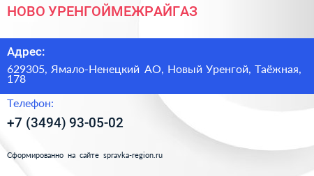 НОВО-УРЕНГОЙМЕЖРАЙГАЗ по адресу 629305, Ямало-Ненецкий АО, Новый Уренгой, Таёжная, 178 в дальнейшем Организация, размещена в следующих категориях: