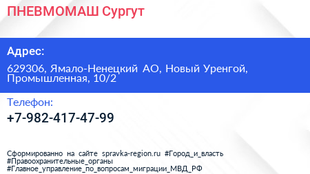 ПНЕВМОМАШ-Сургут по адресу 629306, Ямало-Ненецкий АО, Новый Уренгой, Промышленная, 10/2 в дальнейшем Организация, размещена в следующих категориях: