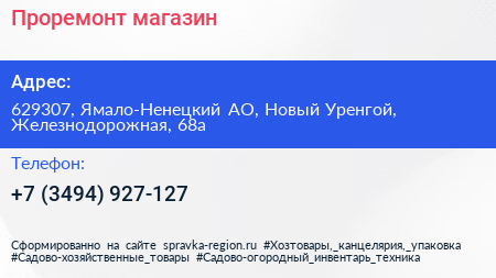 Проремонт, магазин по адресу 629307, Ямало-Ненецкий АО, Новый Уренгой, Железнодорожная, 68а в дальнейшем Организация, размещена в следующих категориях:
