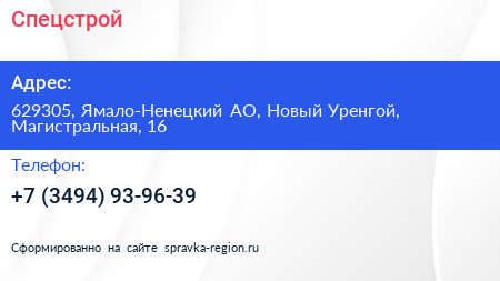 Спецстрой по адресу 629305, Ямало-Ненецкий АО, Новый Уренгой, Магистральная, 16 в дальнейшем Организация, размещена в следующих категориях: