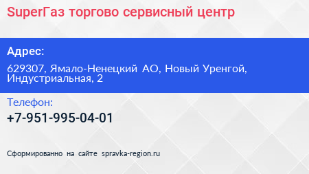 SuperГаз, торгово-сервисный центр по адресу 629307, Ямало-Ненецкий АО, Новый Уренгой, Индустриальная, 2 в дальнейшем Организация, размещена в следующих категориях: