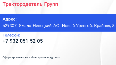 Трактородеталь Групп по адресу 629307, Ямало-Ненецкий АО, Новый Уренгой, Крайняя, 8 в дальнейшем Организация, размещена в следующих категориях: