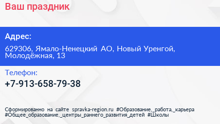 Ваш праздник по адресу 629306, Ямало-Ненецкий АО, Новый Уренгой, Молодёжная, 13 в дальнейшем Организация, размещена в следующих категориях: