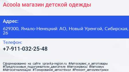 Acoola, магазин детской одежды по адресу 629300, Ямало-Ненецкий АО, Новый Уренгой, Сибирская, 26 в дальнейшем Организация, размещена в следующих категориях: