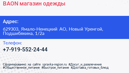 BAON, магазин одежды по адресу 629303, Ямало-Ненецкий АО, Новый Уренгой, Подшибякина, 1/2а в дальнейшем Организация, размещена в следующих категориях: