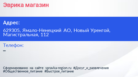 Эврика, магазин по адресу 629305, Ямало-Ненецкий АО, Новый Уренгой, Магистральная, 112 в дальнейшем Организация, размещена в следующих категориях: