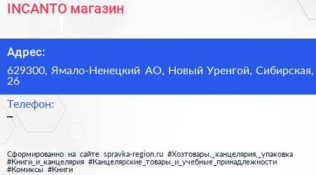 INCANTO, магазин по адресу 629300, Ямало-Ненецкий АО, Новый Уренгой, Сибирская, 26 в дальнейшем Организация, размещена в следующих категориях: