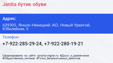 Janita, бутик обуви по адресу 629305, Ямало-Ненецкий АО, Новый Уренгой, Юбилейная, 5 в дальнейшем Организация, размещена в следующих категориях:
