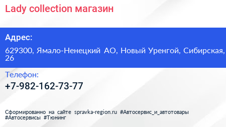 Lady collection, магазин по адресу 629300, Ямало-Ненецкий АО, Новый Уренгой, Сибирская, 26 в дальнейшем Организация, размещена в следующих категориях: