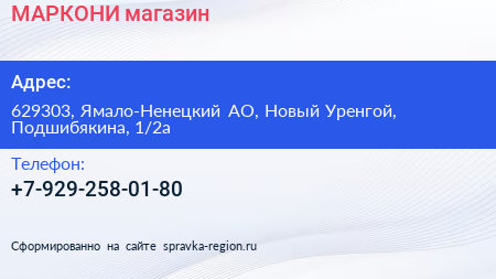 МАРКОНИ, магазин по адресу 629303, Ямало-Ненецкий АО, Новый Уренгой, Подшибякина, 1/2а в дальнейшем Организация, размещена в следующих категориях: