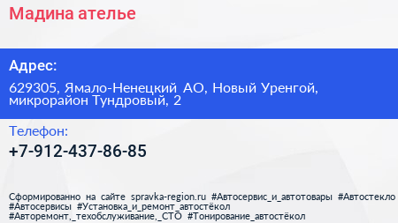 Мадина, ателье по адресу 629305, Ямало-Ненецкий АО, Новый Уренгой, микрорайон Тундровый, 2 в дальнейшем Организация, размещена в следующих категориях:
