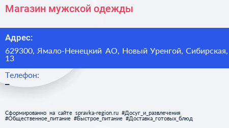 Магазин мужской одежды по адресу 629300, Ямало-Ненецкий АО, Новый Уренгой, Сибирская, 13 в дальнейшем Организация, размещена в следующих категориях: