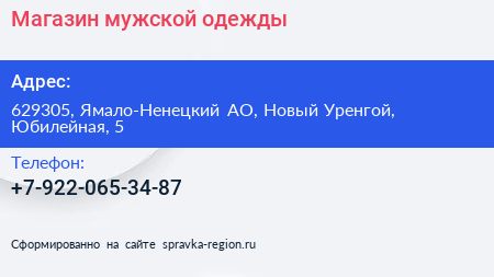 Магазин мужской одежды по адресу 629305, Ямало-Ненецкий АО, Новый Уренгой, Юбилейная, 5 в дальнейшем Организация, размещена в следующих категориях:
