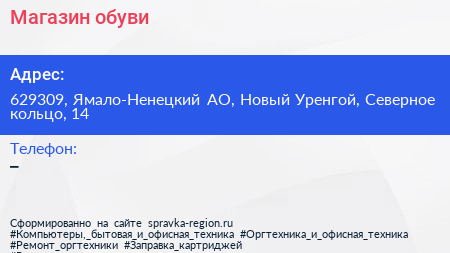 Магазин обуви по адресу 629309, Ямало-Ненецкий АО, Новый Уренгой, Северное кольцо, 14 в дальнейшем Организация, размещена в следующих категориях: