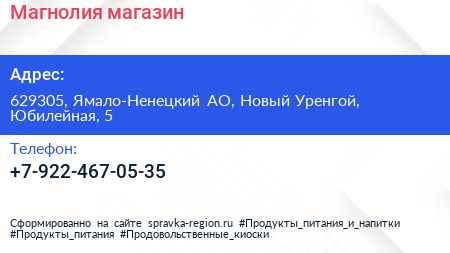 Магнолия, магазин по адресу 629305, Ямало-Ненецкий АО, Новый Уренгой, Юбилейная, 5 в дальнейшем Организация, размещена в следующих категориях: