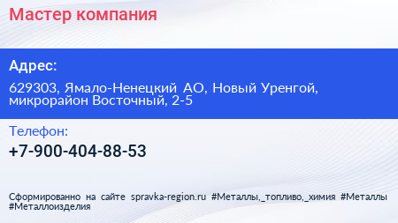 Мастер, компания по адресу 629303, Ямало-Ненецкий АО, Новый Уренгой, микрорайон Восточный, 2-5 в дальнейшем Организация, размещена в следующих категориях: