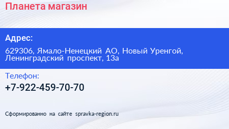 Планета, магазин по адресу 629306, Ямало-Ненецкий АО, Новый Уренгой, Ленинградский проспект, 13а в дальнейшем Организация, размещена в следующих категориях: