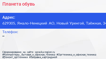 Планета обувь по адресу 629305, Ямало-Ненецкий АО, Новый Уренгой, Таёжная, 34 в дальнейшем Организация, размещена в следующих категориях: