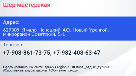 Шер, мастерская по адресу 629309, Ямало-Ненецкий АО, Новый Уренгой, микрорайон Советский, 5-1 в дальнейшем Организация, размещена в следующих категориях: