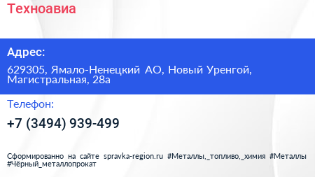 Техноавиа по адресу 629305, Ямало-Ненецкий АО, Новый Уренгой, Магистральная, 28а в дальнейшем Организация, размещена в следующих категориях: