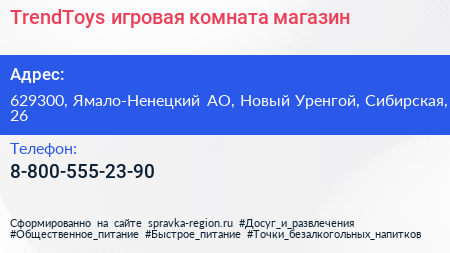 TrendToys, игровая комната-магазин по адресу 629300, Ямало-Ненецкий АО, Новый Уренгой, Сибирская, 26 в дальнейшем Организация, размещена в следующих категориях: