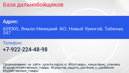 База дальнобойщиков по адресу 629305, Ямало-Ненецкий АО, Новый Уренгой, Таёжная, 147 в дальнейшем Организация, размещена в следующих категориях:
