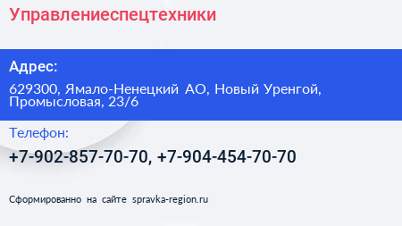 Управлениеспецтехники по адресу 629300, Ямало-Ненецкий АО, Новый Уренгой, Промысловая, 23/6 в дальнейшем Организация, размещена в следующих категориях: