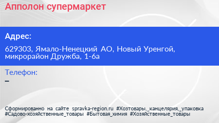 Апполон, супермаркет по адресу 629303, Ямало-Ненецкий АО, Новый Уренгой, микрорайон Дружба, 1-6а в дальнейшем Организация, размещена в следующих категориях: