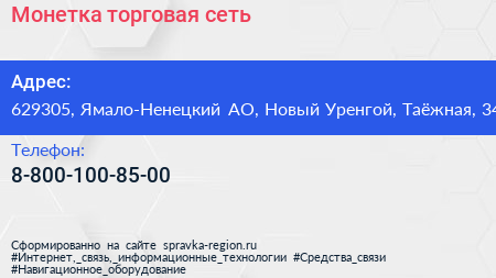 Монетка, торговая сеть по адресу 629305, Ямало-Ненецкий АО, Новый Уренгой, Таёжная, 34 в дальнейшем Организация, размещена в следующих категориях: