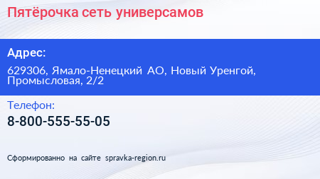 Пятёрочка, сеть универсамов по адресу 629306, Ямало-Ненецкий АО, Новый Уренгой, Промысловая, 2/2 в дальнейшем Организация, размещена в следующих категориях: