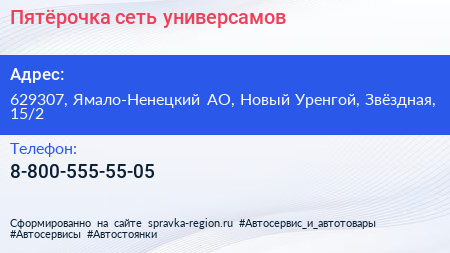 Пятёрочка, сеть универсамов по адресу 629307, Ямало-Ненецкий АО, Новый Уренгой, Звёздная, 15/2 в дальнейшем Организация, размещена в следующих категориях: