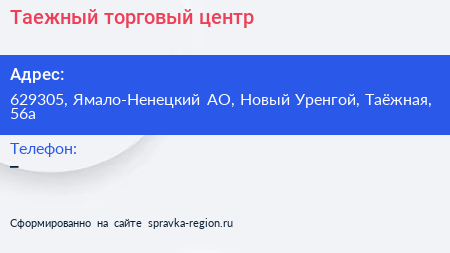 Таежный, торговый центр по адресу 629305, Ямало-Ненецкий АО, Новый Уренгой, Таёжная, 56а в дальнейшем Организация, размещена в следующих категориях: