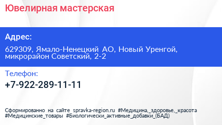 Ювелирная мастерская по адресу 629309, Ямало-Ненецкий АО, Новый Уренгой, микрорайон Советский, 2-2 в дальнейшем Организация, размещена в следующих категориях: