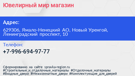 Ювелирный мир, магазин по адресу 629306, Ямало-Ненецкий АО, Новый Уренгой, Ленинградский проспект, 10 в дальнейшем Организация, размещена в следующих категориях: