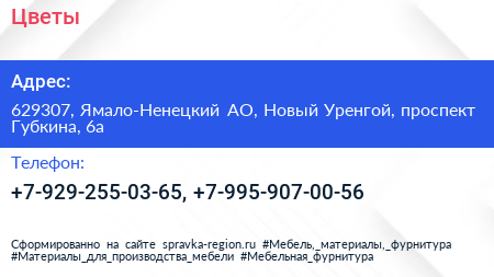 Цветы по адресу 629307, Ямало-Ненецкий АО, Новый Уренгой, проспект Губкина, 6а в дальнейшем Организация, размещена в следующих категориях: