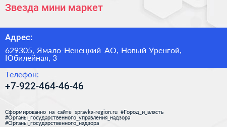Звезда, мини-маркет по адресу 629305, Ямало-Ненецкий АО, Новый Уренгой, Юбилейная, 3 в дальнейшем Организация, размещена в следующих категориях: