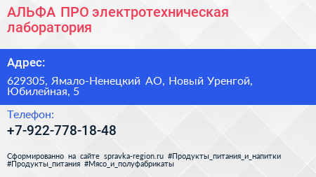 АЛЬФА.ПРО, электротехническая лаборатория по адресу 629305, Ямало-Ненецкий АО, Новый Уренгой, Юбилейная, 5 в дальнейшем Организация, размещена в следующих категориях: