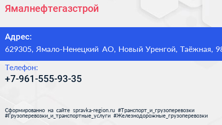Ямалнефтегазстрой по адресу 629305, Ямало-Ненецкий АО, Новый Уренгой, Таёжная, 98 в дальнейшем Организация, размещена в следующих категориях: