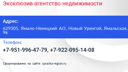 Эксклюзив, агентство недвижимости по адресу 629305, Ямало-Ненецкий АО, Новый Уренгой, Ямальская, 9в в дальнейшем Организация, размещена в следующих категориях:
