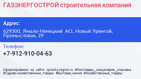 ГАЗЭНЕРГОСТРОЙ, строительная компания по адресу 629300, Ямало-Ненецкий АО, Новый Уренгой, Промысловая, 29 в дальнейшем Организация, размещена в следующих категориях: