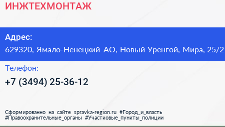 ИНЖТЕХМОНТАЖ по адресу 629320, Ямало-Ненецкий АО, Новый Уренгой, Мира, 25/2 в дальнейшем Организация, размещена в следующих категориях: