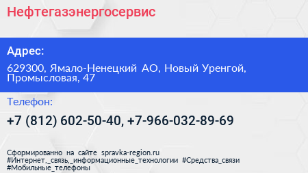 Нефтегазэнергосервис по адресу 629300, Ямало-Ненецкий АО, Новый Уренгой, Промысловая, 47 в дальнейшем Организация, размещена в следующих категориях: