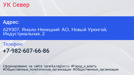УК Север по адресу 629307, Ямало-Ненецкий АО, Новый Уренгой, Индустриальная, 2 в дальнейшем Организация, размещена в следующих категориях: