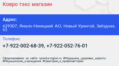 Ковро-тэкс, магазин по адресу 629307, Ямало-Ненецкий АО, Новый Уренгой, Звёздная, 61 в дальнейшем Организация, размещена в следующих категориях: