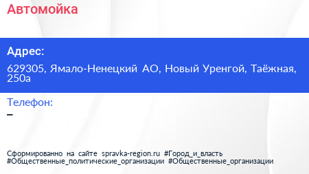 Автомойка по адресу 629305, Ямало-Ненецкий АО, Новый Уренгой, Таёжная, 250а в дальнейшем Организация, размещена в следующих категориях: