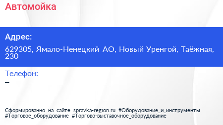 Автомойка по адресу 629305, Ямало-Ненецкий АО, Новый Уренгой, Таёжная, 230 в дальнейшем Организация, размещена в следующих категориях: