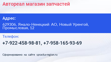 Автореал, магазин запчастей по адресу 629306, Ямало-Ненецкий АО, Новый Уренгой, Промысловая, 12 в дальнейшем Организация, размещена в следующих категориях: