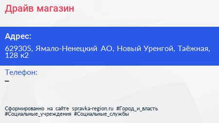 Драйв, магазин по адресу 629305, Ямало-Ненецкий АО, Новый Уренгой, Таёжная, 128 к2 в дальнейшем Организация, размещена в следующих категориях: